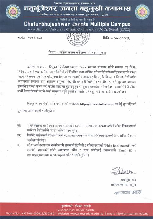 यही मिति २०८२ पौष २५ गते शुक्रबार क्याम्पस समयभित्र परिक्षा फारम भरी परिक्षा