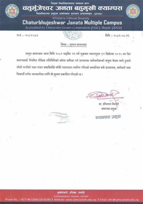 गरिएको सम्बन्धित सबै प्राध्यापक, कर्मचारी तथा विद्यार्थी वर्गमा जानकारीका लागि
