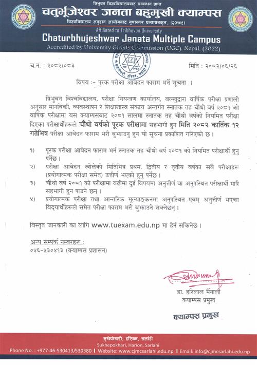 प्रस्तुत सम्बन्धमा मिति २०८२ असोज ११ गते बसेको क्याम्पस संचालक समितिको बैठक निर्णय बमोजिम यस क्याम्पसको नियमित क्याम्पस सभा - २०८२ तपसिल बमोजिम आयोजना गरिने भएअनुसार क्याम्पसको नबौं संशोधित विधानको दफा १३(ङ) को आधारमा सम्बन्धित सबैमा यसै सुचनालाई आधारमानी उपस्थितिका निमित्त जानकारी सहित सादर अनुरोध गरिएको छ ।