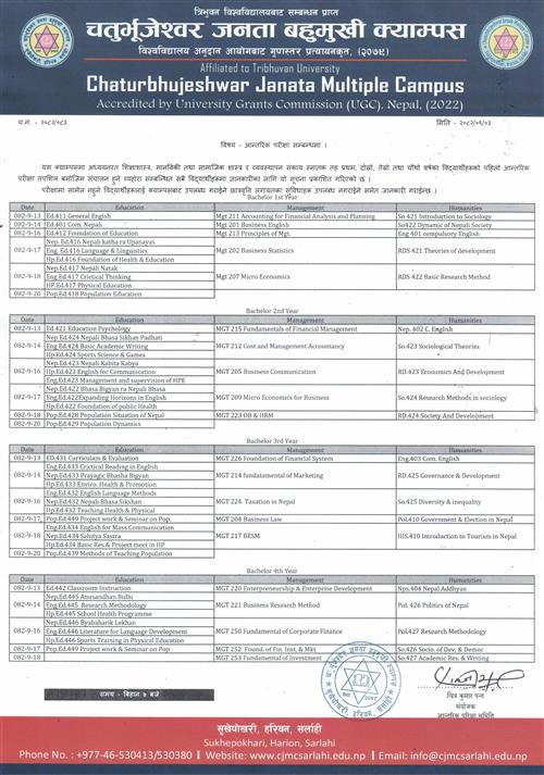 त्रिभुवन विश्वविद्यालयद्वारा २०८२ सालमा संचालन गरिने स्नातक तह बि.ए., बि.बि.एस. र बि.एड. कार्यक्रम अन्तर्गत तेश्रो वर्ष नियमित  तथा आंशिक परीक्षा दिने परीक्षार्थीहरूका लागि परिक्षा फारम भर्ने सुचना प्रकाशित गरिए बमोजिम यस क्याम्पसको स्नातक तह बि.ए., बि.बि.एस. र बि.एड. तेश्रो वर्षमा अध्ययनरत नियमित तथा आंशिक समुहका विद्यार्थीहरुले यही मिति २०८२ पौष २५ गते शुक्रबार क्याम्पस समयभित्र परिक्षा फारम भरी परिक्षा शाखामा बुझाउनु हुन यो सुचना प्रकाशित गरिएको छ । समय भित्रै नै परिक्षा नभर्ने विद्यार्थीहरुको लागि अर्को व्यवस्था नहुने हुनाले समयप्रति सचेत हुन पनि जानकारी गराईएको छ ।