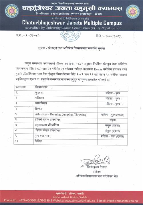 खेलकुद तथा अतिरिक्त क्रियाकलाप सम्बन्धि सुचना